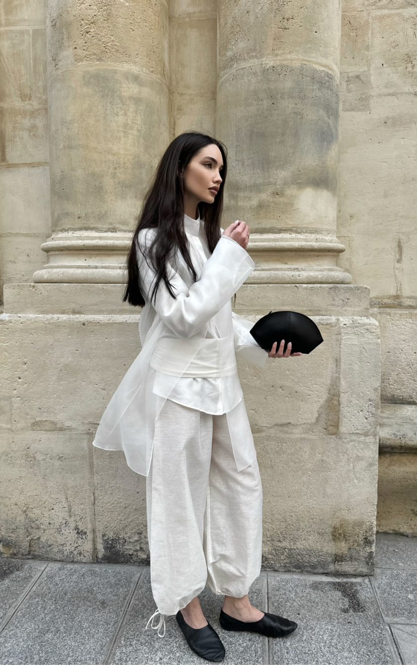 Over time I understood that creating an outfit always begins, for me, with the material itself. The touch of fabric against the skin feels like a dialogue. It’s important that the material resonates with my state of mind. There’s only one principle I never violate: to remain myself and never say “never.” Today I may be certain I won’t wear green, and tomorrow I might discover the deepest shade of green and fall in love with it. Openness to experimentation is part of my aesthetic.