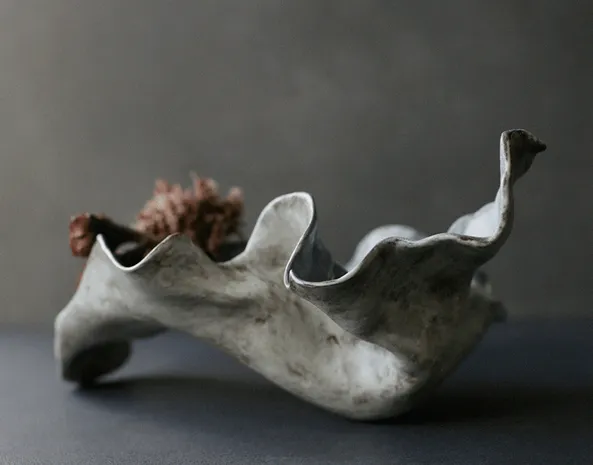 These objects are self-contained interior compositions — they may serve as fruit bowls, vessels for dried flowers, or floral arrangements on kenzan. Yet their true purpose lies not in utility, but in aesthetic presence. Each piece is a silent gesture, a tactile poem woven into the everyday.