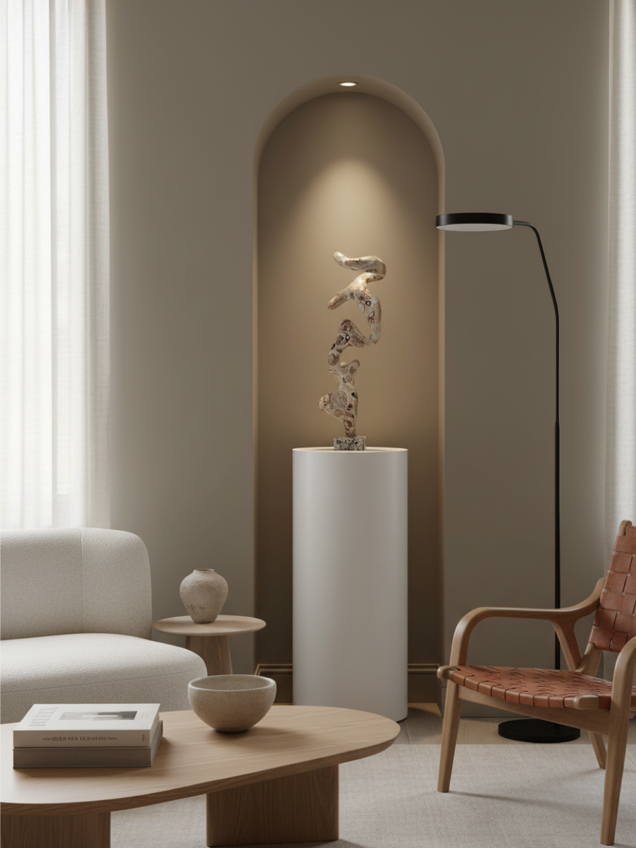 Lev Efimov is a contemporary Russian sculptor whose artistic journey began with street art and photography and eventually led him to create unique plastic forms. Born in Pskov and trained as a psychologist, he retained a particular sensitivity to human perception and the environment, which became an integral part of his artistic practice. For many years, Efimov worked as a photographer, collaborating with magazines such as Vogue and Grazia, crafting compelling visual narratives. In 2020, during the pandemic, he made a decisive turn toward sculpture and founded his own studio, transforming it into a laboratory for experimentation with materials and form. His works are inspired by the fluidity and organic quality of lines, balancing softness and strength, where nature converges with the aesthetics of digital 3D thinking. Each of his creations embodies a pursuit of harmony between nature and technology, tradition and the future, turning his sculptures into more than objects—they become mediators of dialogue between space and human presence.
